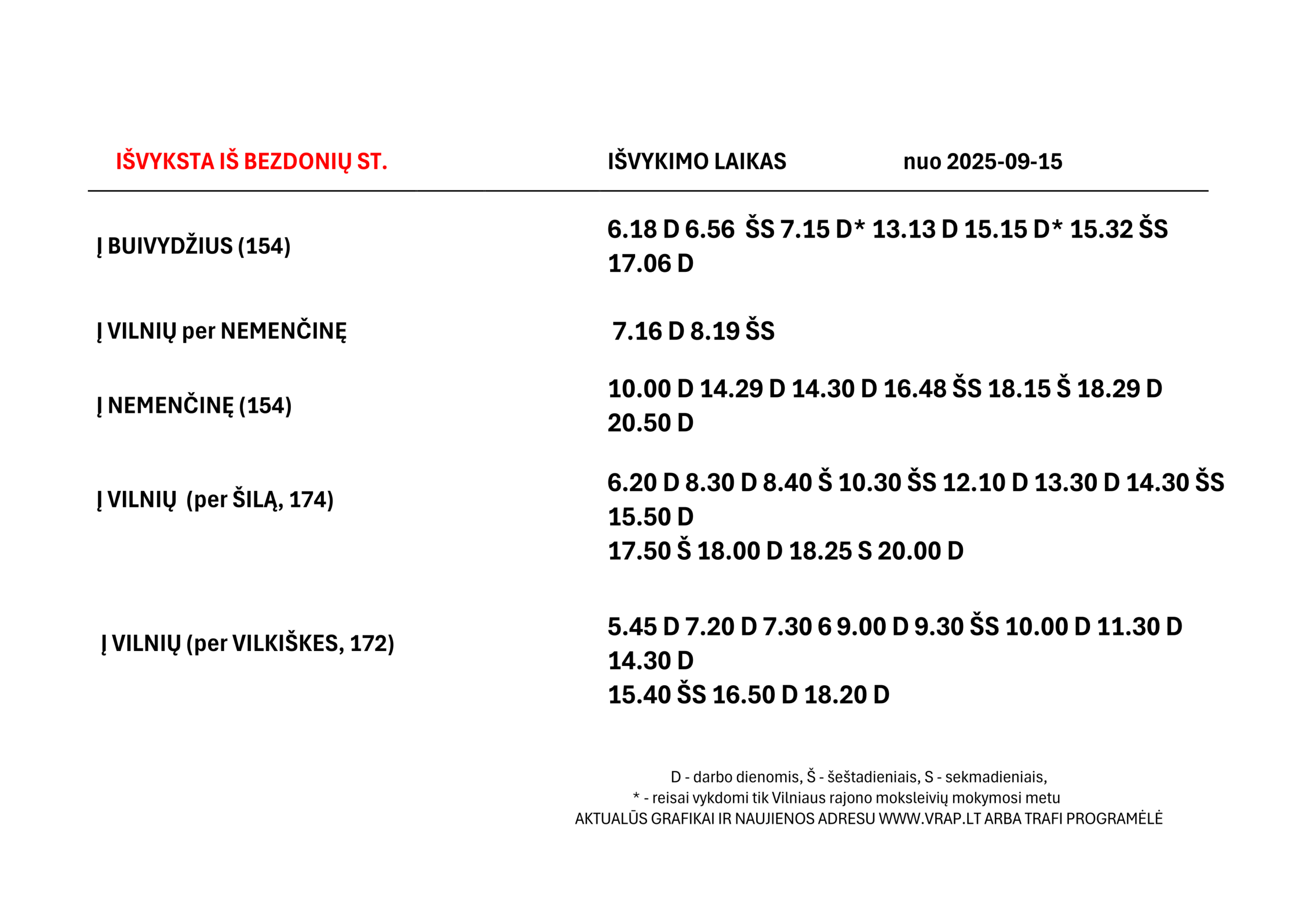 Nemenčinės pl., Kiškių, Smėlynė, Veržuvos st., Karačiūnai, Šilas, Antaviliai, Miškonys, Kreivalaužiai, Vėtrungė, Nemenčinė, Nemenčinės poliklinika, Mokykla, Žiedas, A.Mickevičiaus, Miško urėdija (nuo 2025 02 10), Nemenčinė II (nuo 2025 02 10), Pučkalaukis, Kabiškės1, Kabiškės2, Kabiškės3 , Krikščioniškės, Ragūnai, Vėriškės, Pakryžė, Aleksandriškės, Raistelis, Stakinė, Minkeliai, Ponasai, Pauliukonys, Sužionys, Danilava, Daukšiai, Skirlėnai, Dvyliškės, Sapiegiškės, Kirnė, Kaidonėliai, Našiūnai, Ryšininkai, Gėla, Kukutiškės (nuo 2025 02 10), Pos. į Bezdonis (nuo 2025 02 10), Gel. pervaža (nuo 2025 02 10), Bezdonys (nuo 2025 02 10), Arvydai, Pušinė, Skersabaliai, Pakalniai, Balėnai 1, Akuotninkai, Balėnai 2, Punžonys, Stražninkai, Vilkinė, Buivydžiai, Girininkija, Pakrauglė, Raudondvaris, Raudondvario ežeras, Miškiniai, Pailgė, Rudausiai, Rūžiškės, Družiliai, Jusinė, Sapiegiškės.