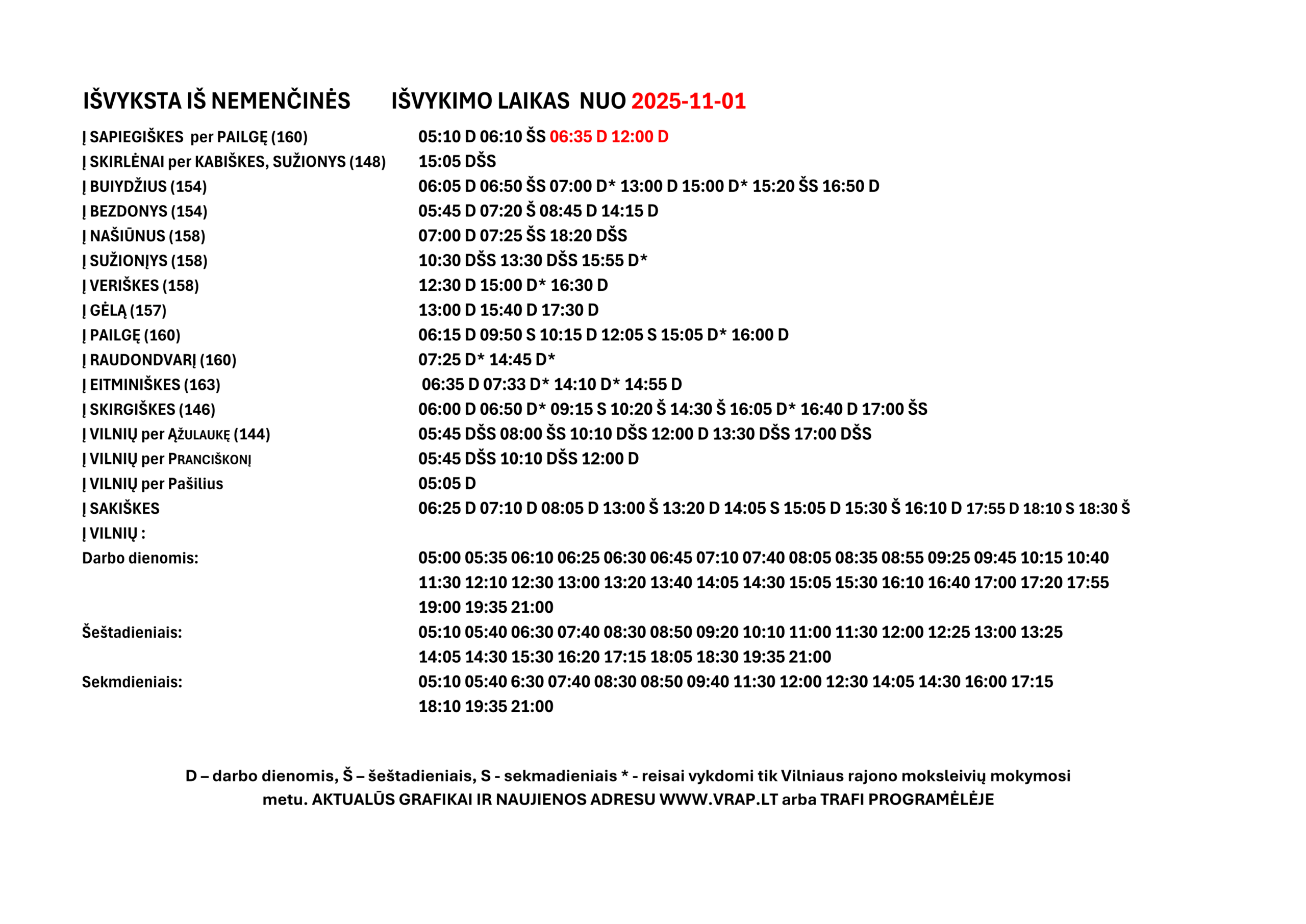 Nemenčinės pl., Kiškių, Smėlynė, Veržuvos st., Karačiūnai, Šilas, Antaviliai, Miškonys, Kreivalaužiai, Vėtrungė, Nemenčinė, Nemenčinės poliklinika, Mokykla, Žiedas, A.Mickevičiaus, Miško urėdija (nuo 2025 02 10), Nemenčinė II (nuo 2025 02 10), Pučkalaukis, Kabiškės1, Kabiškės2, Kabiškės3 , Krikščioniškės, Ragūnai, Vėriškės, Pakryžė, Aleksandriškės, Raistelis, Stakinė, Minkeliai, Ponasai, Pauliukonys, Sužionys, Danilava, Daukšiai, Skirlėnai, Dvyliškės, Sapiegiškės, Kirnė, Kaidonėliai, Našiūnai, Ryšininkai, Gėla, Kukutiškės (nuo 2025 02 10), Pos. į Bezdonis (nuo 2025 02 10), Gel. pervaža (nuo 2025 02 10), Bezdonys (nuo 2025 02 10), Arvydai, Pušinė, Skersabaliai, Pakalniai, Balėnai 1, Akuotninkai, Balėnai 2, Punžonys, Stražninkai, Vilkinė, Buivydžiai, Girininkija, Pakrauglė, Raudondvaris, Raudondvario ežeras, Miškiniai, Pailgė, Rudausiai, Rūžiškės, Družiliai, Jusinė, Sapiegiškės.
